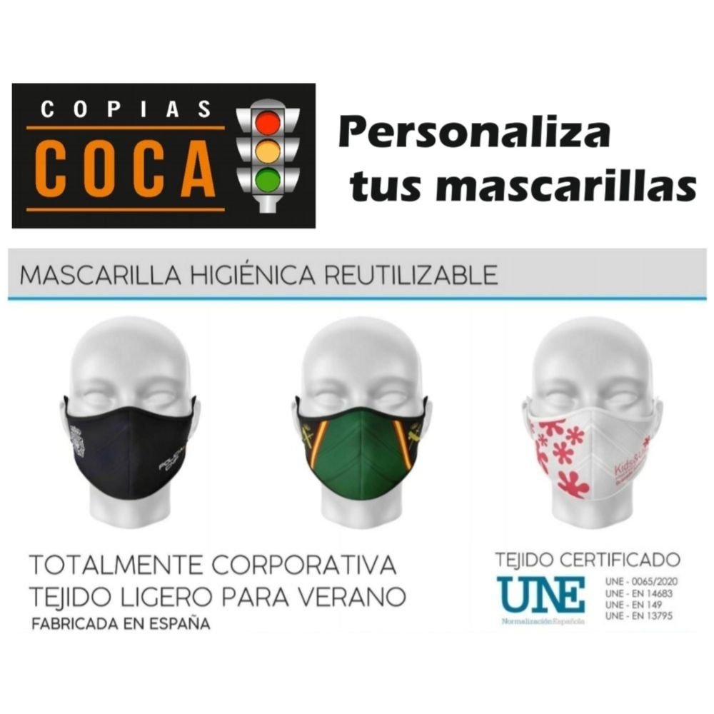 En Copias Coca te ofrecemos mascarillas personalizas reutilizables en Granada FFP2 con certificación. Nos puedes traer tu diseño o te podemos realizar nosotros uno especial para ti. También puedes optar por alguno de nuestros diseños ya realizados.