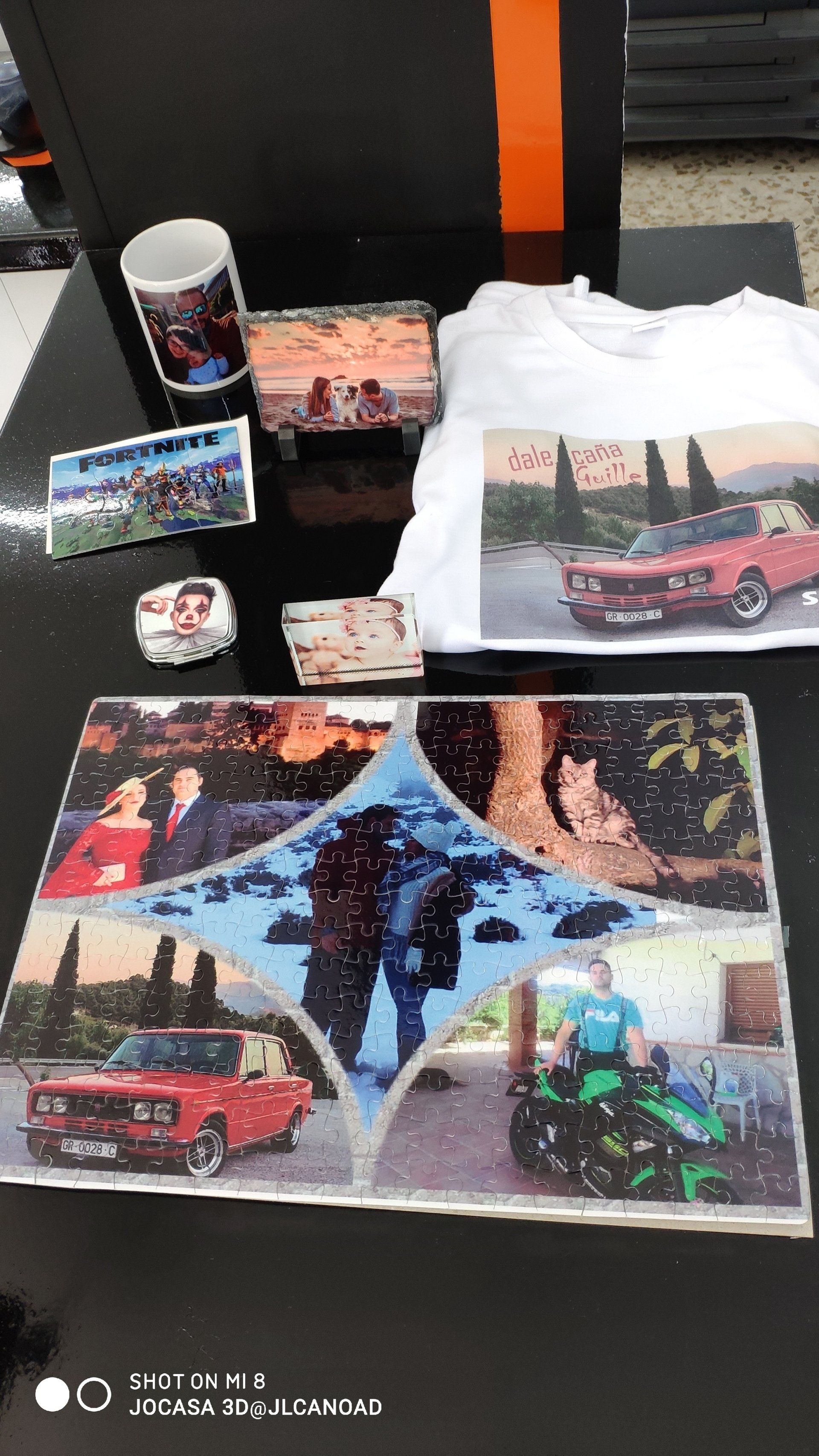Portafotos, recuerdos de comunión, invitaciones de boda, tarjetas de visita, tazas, botellas de aluminio, chapas, imanes, calendarios, puzzles, juegos, alfombrillas de ratón, mascarillas, llaveros, espejos de bolso, bolsas de tela, cojines, impresión en cristal, en piedra, en azulejo, etc.